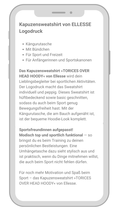 - Die Texte haben eine hohe Qualität, liefern alle wichtigen Informationen und Inspirationen (z.B. Tragetipps), die sich positiv auf die Kaufentscheidung auswirken.